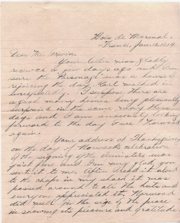 Your address of Thanksgiving on the day of Norwood’s celebration of the signing of the Armistice was just fine and I’m very glad you sent it to me. After I read it aloud to the chaps in my shack it was passed around to all the huts and everyone appreciated it. Norwood did well for the size of the place in showing its pleasure and gratitude.