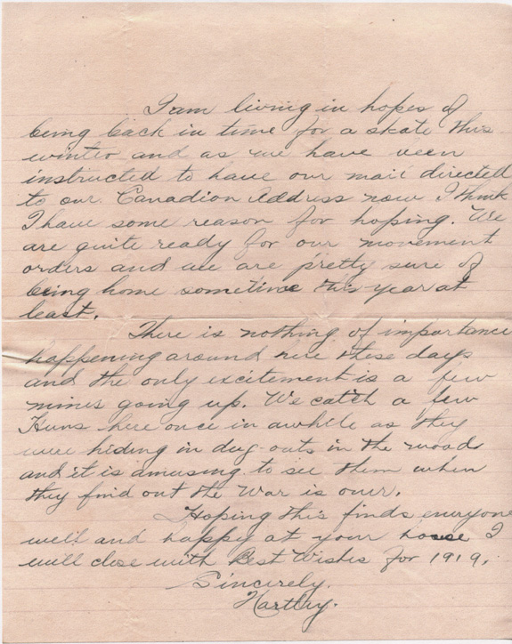 There is nothing of importance happening around here these days and the only excitement is a few mines going up. We catch a few Huns here once in awhile as they were hiding in dug-outs in the woods and it is amusing to see them when they find out the War is over.