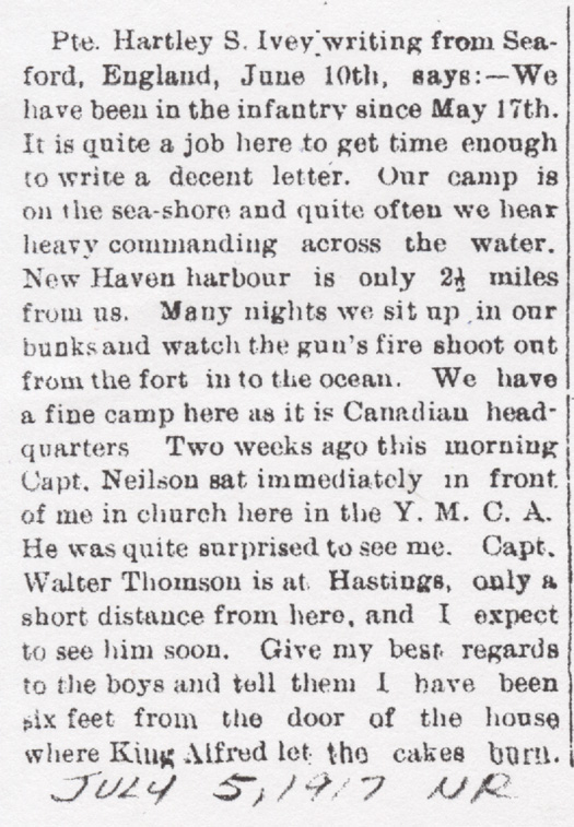 Pte. Hartley S. Ivey writing from Seaford, England, June 10th, says:- We have been in the infantry since May 17th.  It is quite a job here to get enough time to write a decent letter.  Our camp is on the sea-shore and quite often we hear heavy commanding across the water.  New Haven harbour is only 2 1/2 miles from us.  Many nights we sit up in our bunks and watch the gun's fire shoot ouit from the fort in to the ocean.  We have a fine camp here as it is Canadian headquarters.  Two weeks ago this morning Capt. Neilson sat immediately in front of me in church here in the Y.M.C.A.  He was quite surprised to see me.  Capt. Walter Thomson is at Hastings, only a short distance from here, and I expect to see him soon.  Give my best regards to the boys and tell them I have been six feet from the door of the house where King Alfred let the cakes burn.