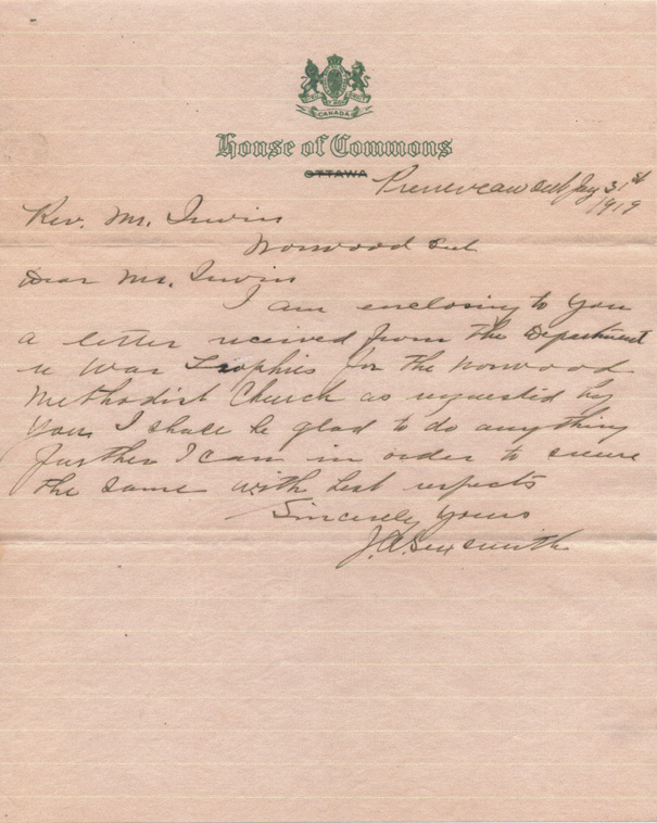 I am enclosing to you a letter received from The Department in War Trophies for the Norwood Methodist Church as requested by you. I shall be glad to do anything further I can in order to secure the same with [?] [?]