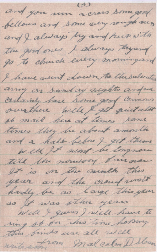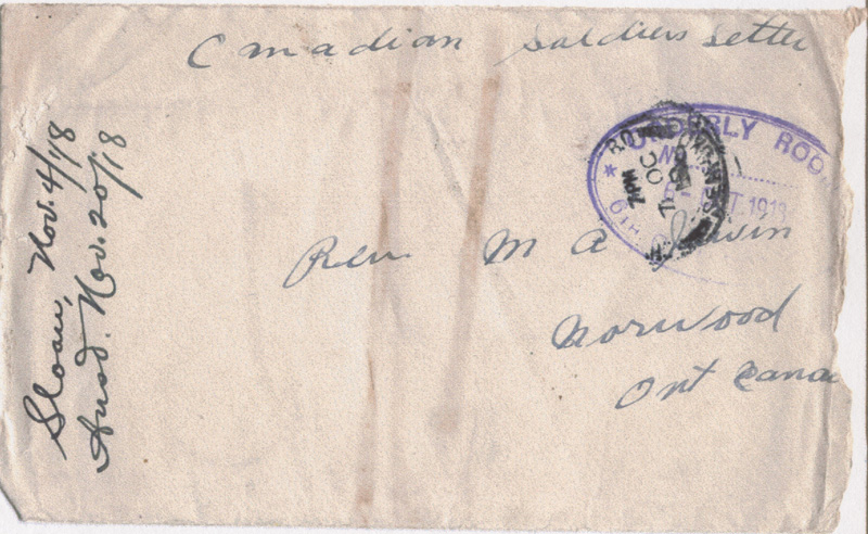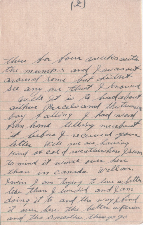 Well it is to bad about Arthur Parcels and the townsend boy falling I had word from home telling me about it before I received you letter. Well we are having kind of cold weather here I seem to mind it worse over here than in Canada Well Mr. Irwin I am trying to live a better life than I ever did and I am doing it to and the way I find it over here the better a person and the smoother things go and you run across some good fellows and some very rough ones and I always try and keep with the good ones I always try and go to church every morning and I have went down to the salvation army on Sunday nights and we certainly have some good cermons over there Well I get quite a lot of mail here at times some times they be about a month and a half before I get them