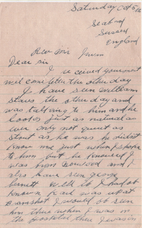 I received your most welcome letter the other day I have seen William Staves the other day and was talking to him and he looks just as natural as ever only not quite as stout as he was he didn’t know me just when I spoke to him but he knowed I was from Norwood and I also have seen george bennet well if I had of known Karl was up at Bramshot I would of seen him there when I was in the Hospital there I was in there for four weeks with the mumps and I was out around some but didn’t see any one that I knowed