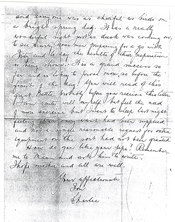 I went up to their starting place last night where the Bde were assembled. The weather was bright and warm and every one was feeling in fine spirits. Jack besides commanding his Platoon is acting second in command of the company. He had his tin hat on and all the paraphernalia necessary and would not accept anything from me excepting some chocolate in a small package which he can have to day besides his biscuits and bully beef. They started forward to be in readiness at 9 PM so when his company left I came back to D.H.Q. I dont suppose I will hear anything until night and can hardly wait until the time slips along but so far all goes well. Prisoners are coming in by batches of 100 or less and every one was as cheerful as birds on a bright spring day. It was a really wonderful sight just as dusk was coming on to see nearly 4,000 men preparing for a go with Fritz and to-day the results of their preparation is being shown. It is a grand success so far and is likely to prove more so before the finish of the day. You will read of this great Battle probably before you receive this letter. I am quite well myself but feel the need of more exercise but I went to sleep last night feeling that every want had been supplied and not a single reasonable request for extra equipment or the sort had not been granted.