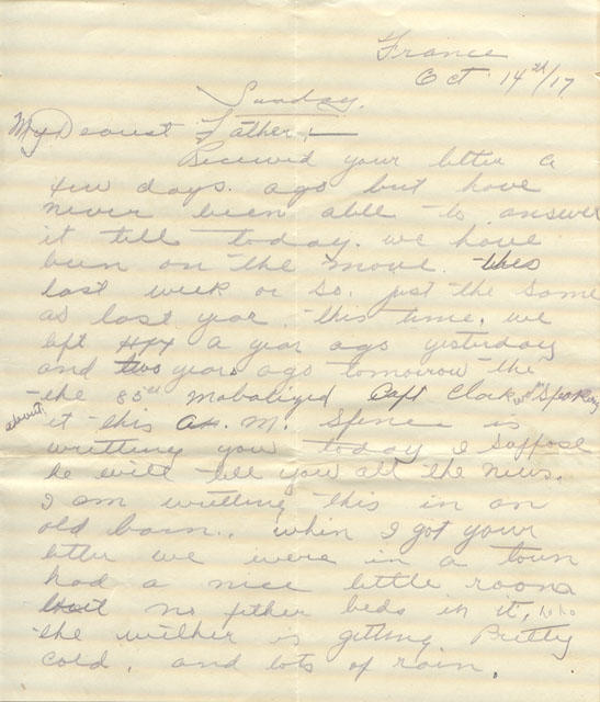 I am writing this in an old barn. when I got your letter we were in a town had a nice little room but no feather beds in it. ha ha the wether is getting pretty cold and lots of rain.