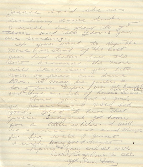 If you want to keep the mare instead of the colt you had better sell the colt because the mare will likely suit you better now as Jessie can drive her. it may be quite a long time before we get back and there are lots of horses. although I want [?] when we do.