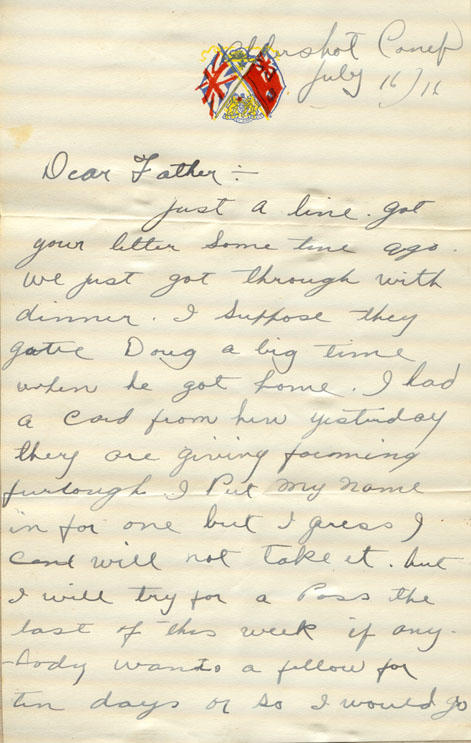 Just a line. got your letter some time ago. we just got through with dinner. I suppose they gave Doug a big time when he got home. I had a card from him yesterday they are giving farming[?] [?] I Put my name in for one but I guess I cant will not take it. But I will try for a Pass the last of this week if any-body wants a fellow for ten days or so I would go