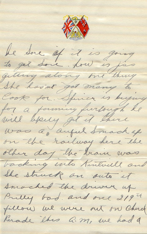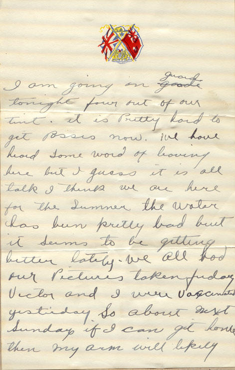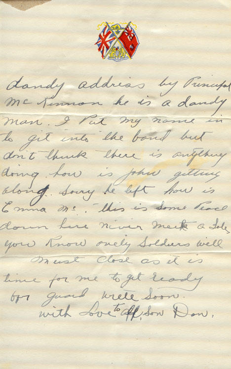 I am going on guard tonight four out of our unit[?]. it is Pretty hard to get passes now. We have heard some word of leaving here but I guess it is all talk I think we are here for the summer. the water has been pretty bad but it seems to be getting better lately. We all had out Pictures take Friday Victor and I were vaccinated yesterday So about next Sunday if I can get home then my arm will likely be sore if it is going to get sore. How is Jess getting one thing she hasn't got many to Cook for. Spencer is buying for a [?] [?] he will likely get it there was a awful smach up on the railway here the other day the train was backing into Kentwell and she was struck an auto it smached the driver up Pretty bad. And once 219th fillow we were out on church parade this a.m, we had a dandy address by Principal McKinnon he is a dandy man. I Put my name in to get into the band but don't think there is anything doing. how is John getting along. sorry he left how is Emma Mc. This is some Peace down here never ment[?] a [?] you Know onely soliders will must close as it is time for me to get ready for guard write Soon.