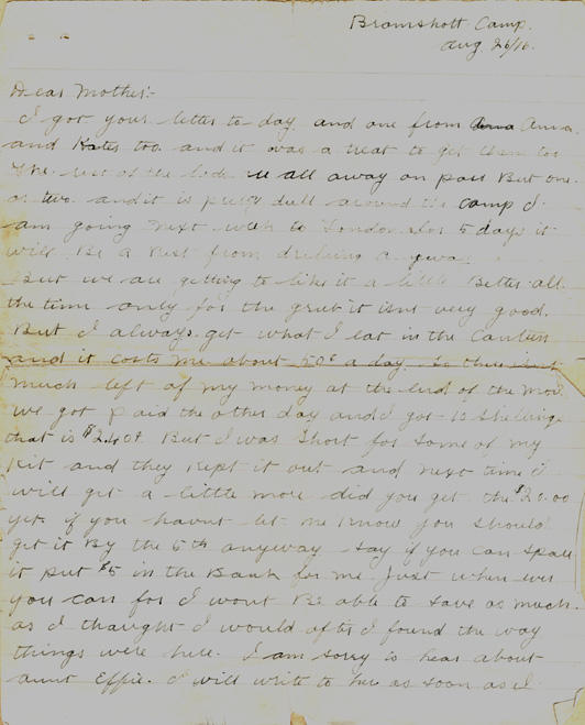 But we are getting to like it a little Better all the time only for the grub it isnt very good. But I always get what I eat in the canteen and it costs me abot 50¢ a days. So there isnt much left of my money at the end of the month. we got paid the other day and I got 10 shillings that is $2.40. But I was short for some of my kit and they kept it out and next time I will get a little more did you get the $20.00 yet. if you havnt let me know you should get it by the 5th anyway. Say if you can spare it put $5 in the Bank for me Just when ever you can for I wont Be able to save as much as I thought I would after I found the way things were here. I am sorry to hear about Aunt Effie. I will write to her as soon as I can. What ever happened Alice Meany Willis didn't know anything about it God help the poor Devil that got her say she cant be anymore than 16 is she. She was no use at home what ever will she Be like now and I dont suppose she will improve very much.