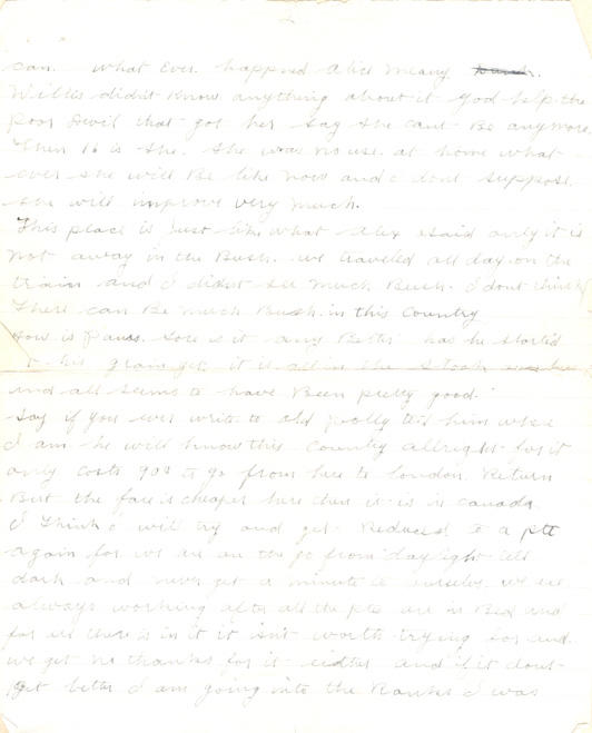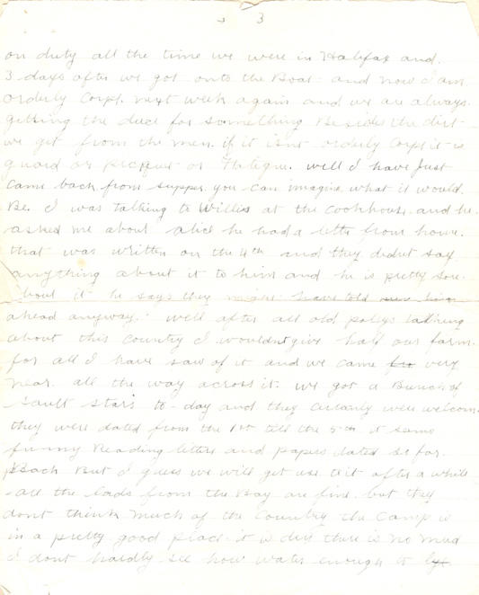 Say if you ever write to Old Polly tell him where I am he will know this country allright for it only cost 90¢ to go from here to London Return But the fare is cheaper here than it is in Canada. I think I will try and get Reduced to a pte again for we are on the go from daylight till dark and never get a minute to ourselves. we are always working after all the ptes are in Bed and for all there is in it it isn't worth trying for and we get no thanks for it either and if it dont get better I am going into the Ranks I was on duty all the time we were in Halifax and 3 days after we got onto the Boat and now I am orderly Corpl. next week again and we are always getting the duce for something Besides the dirt we get from the men. if it isnt orderly Corpl it is guard or picquet or Fatigue. well I have just come back from supper you can imagine what it would Be. I was talking to Willis at the cookhouse and he asked me about Alice he had a letter from home that was written on the 4th and they didnt say anything about it to him and he is pretty sore about it he says they might have told him ahead anyway. Well after all old Pollys talking about this country I wouldnt give half our farm for all I have saw of it and we came very near all the way across it. we got a Bunch of Sault Stars to-day and the cirtanly were welcome. they were dated from the 1st till the 5th it seems funny Reading letters and papers dated so far Back. But I guess we will get use to it after a while all the lads from the Bay are fine but they dont think much of the country the camp is in a pretty good place. it is dry there is no mud I dont hardly see how water enough to lay here to make mud there is so many hills it is Just like Sylvan valley for hills and coming on the train it was Just out of one tunnel into another.