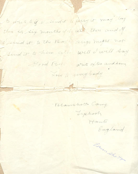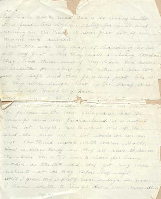 Well I have to go after my Blankets we had them all fumigated to-day ad our clothes the fellows in the Hut Behind us has the mumps and are quarantined.. it is awfull cold at night here to what it is up there and the days are a lot cooler too we are not Bothered much with warm weather how is every Body are they all alive I see in the Star the 227 was to leave for Camp Borden on the 14th did they get any more Recruits at the Bay Before they left well I guess this is pretty near enough for now. I havnt written to Jim yet for I dont know where to write to if I send it to perry it may lay there for six months if he isnt there and if I send it to the Bay might not send it to him either. Well I will say Good Bye. Write often and soon